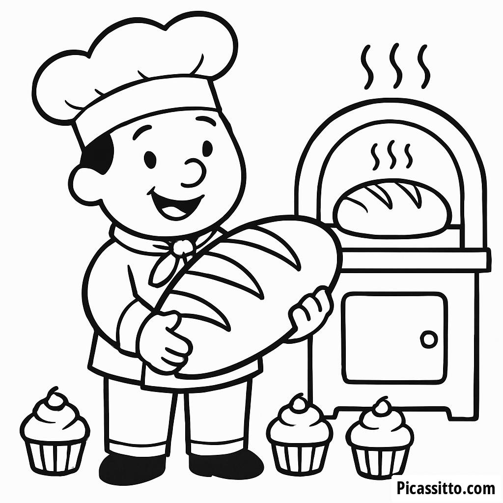 Aproveite esta página para colorir gratuita e imprimível, apresentando um padeiro alegre segurando um enorme pão, cercado por deliciosos cupcakes e um forno quente!