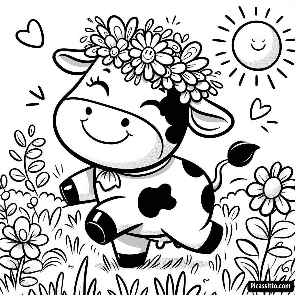 Aproveite esta página para colorir gratuita e imprimível com uma vaca alegre usando uma coroa de flores em um pasto ensolarado!
