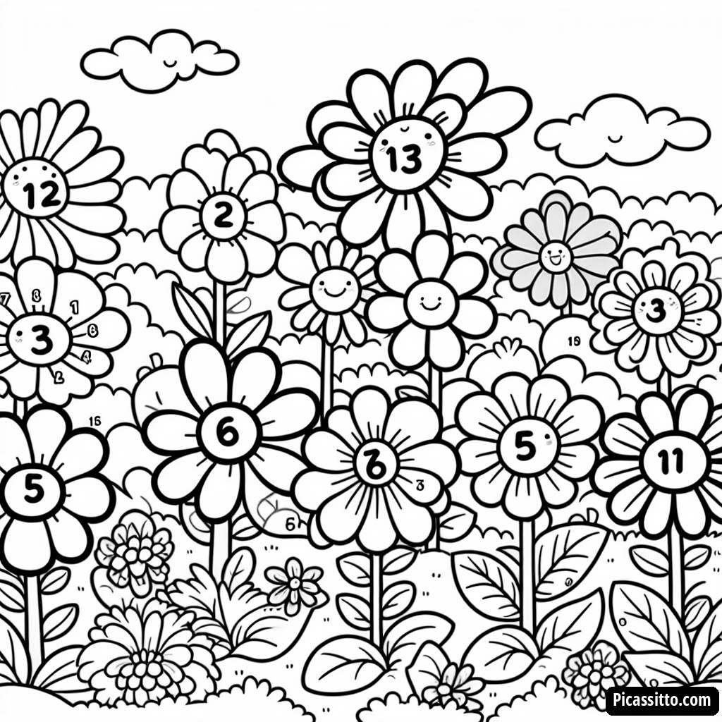 Aproveite esta página para colorir jardim alegre, gratuita e imprimível, com flores rotuladas com os números de 1 a 5 para contar as pétalas!