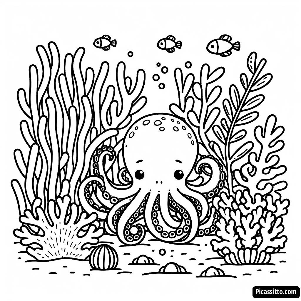 Aproveite esta página para colorir gratuita e imprimível com um polvo escondido entre corais coloridos e peixes pequenos! Deixe sua criatividade fluir enquanto dá vida a esta cena subaquática.