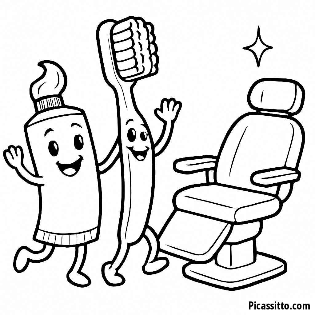 Aproveite esta página para colorir grátis e imprimível com uma escova de dentes e um creme dental alegres dançando ao lado de uma cadeira dental brilhante! Perfeita para ensinar às crianças sobre higiene dental de forma divertida.