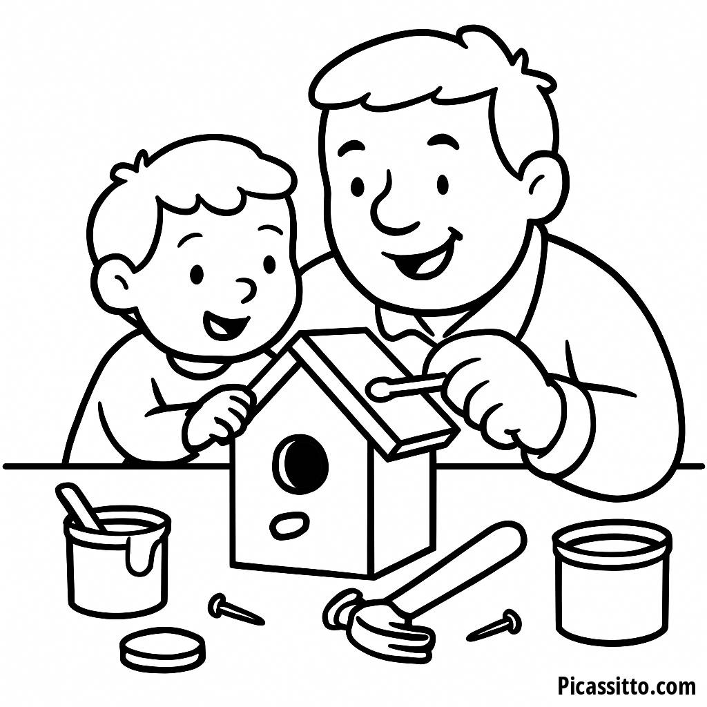 Aproveite esta página para colorir gratuita e imprimível, que apresenta um pai e um filho construindo juntos uma casa para pássaros, perfeita para o Dia dos Pais!