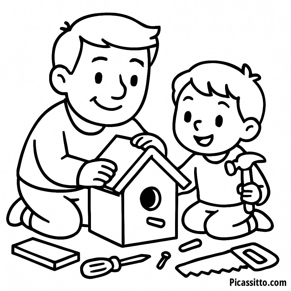 Página para Colorir de Pai e Filho Construindo uma Casa para Pássaros