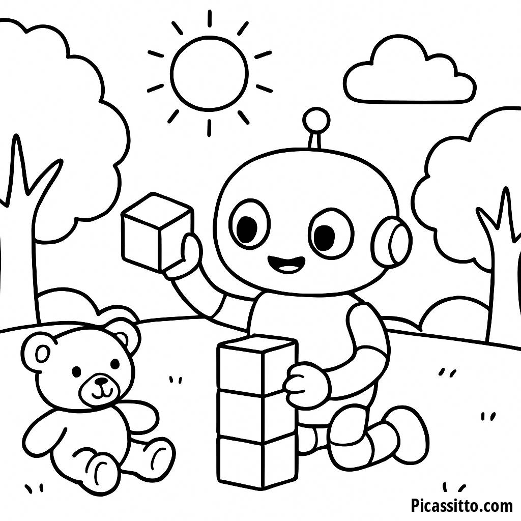 Baixe esta página para colorir gratuita e imprimível de um robô amigável construindo uma torre com blocos coloridos em um parque ensolarado. Perfeita para estimular a criatividade das crianças!