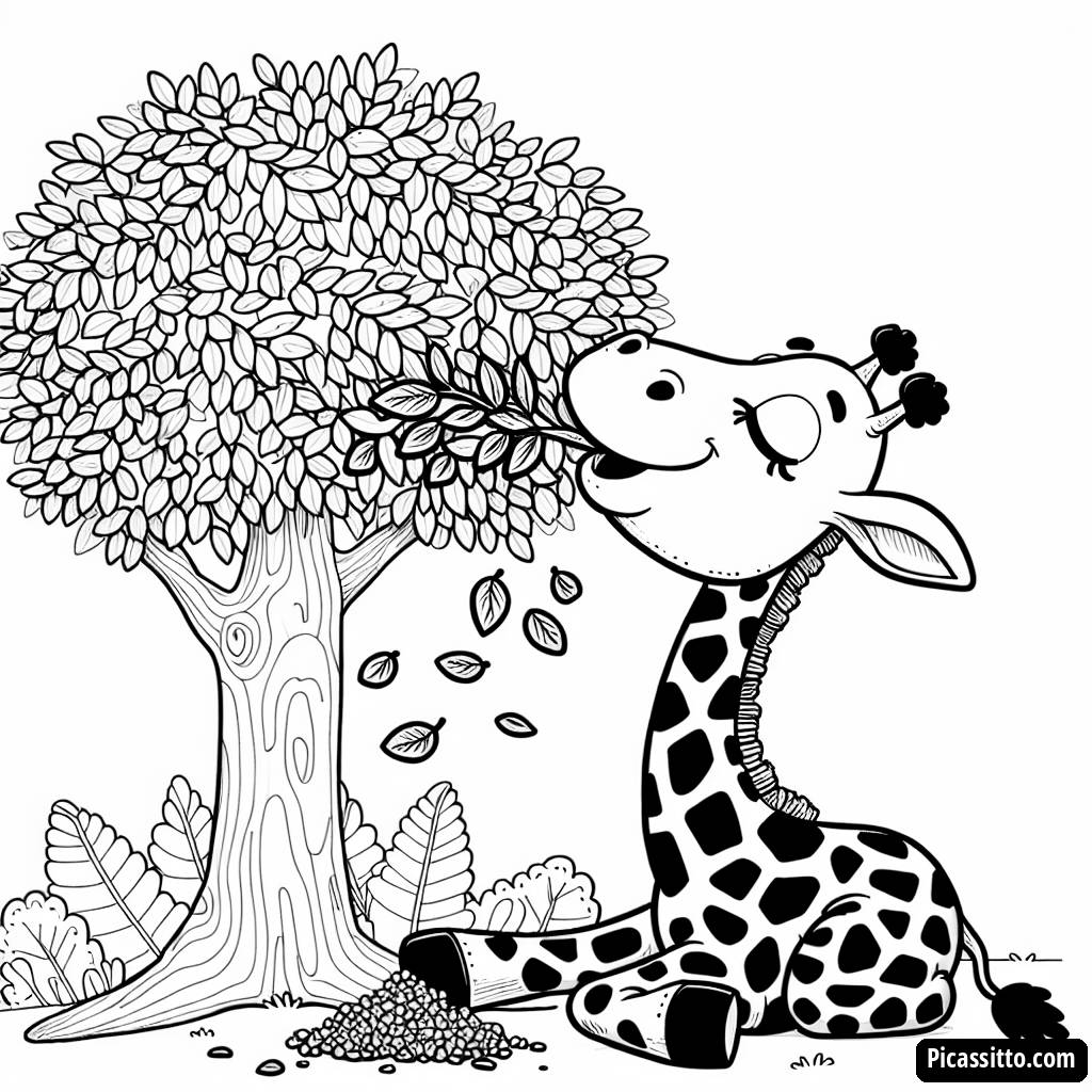 Aproveite esta página de colorir de girafa, gratuita e imprimível, que apresenta um gigante gentil comendo folhas de uma árvore alta. Perfeita para pequenos artistas!