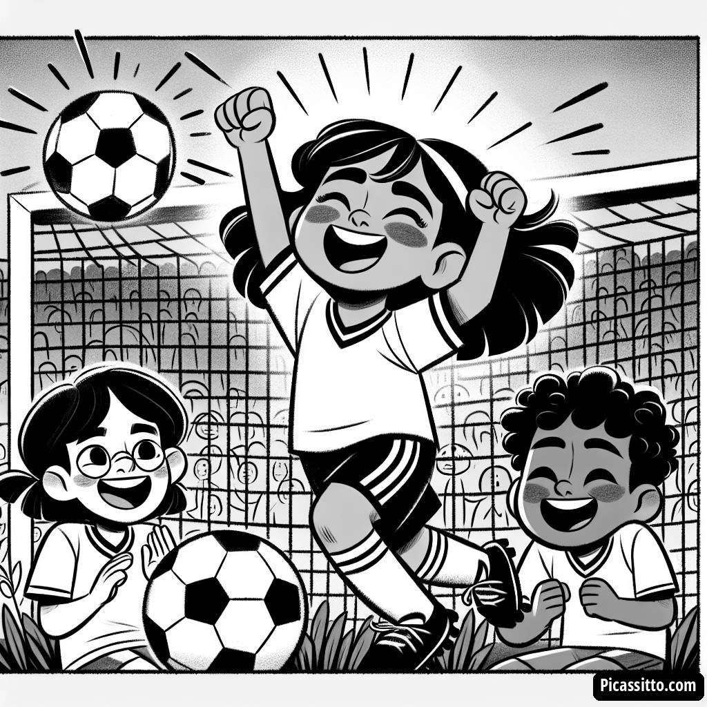 Baixe esta página para colorir gratuita e imprimível de uma criança alegre marcando um gol em um jogo de futebol, cercada por amigos torcendo!