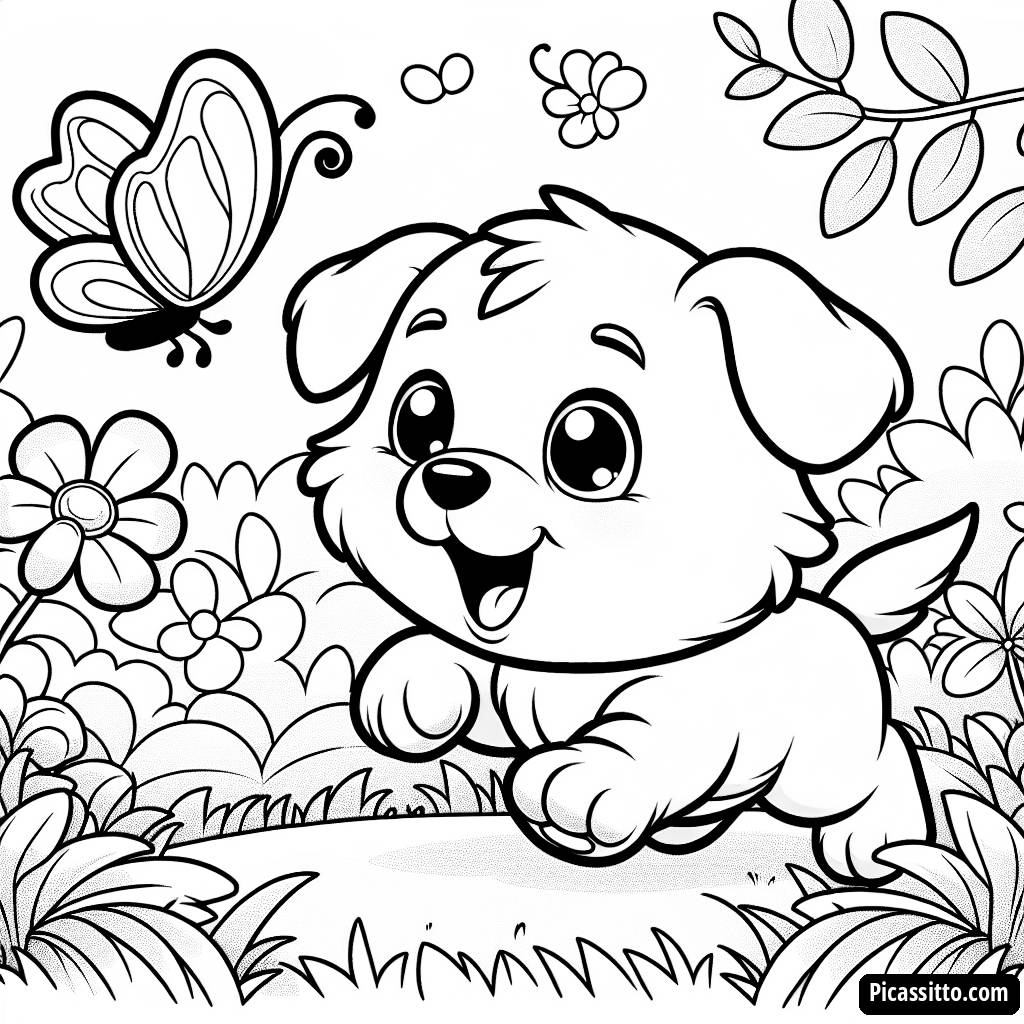 Baixe esta página para colorir gratuita e imprimível de um cachorrinho brincalhão perseguindo uma borboleta em um jardim para diversão sem fim!