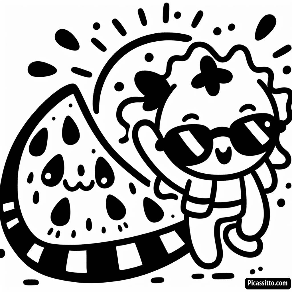 Aproveite esta página para colorir gratuita e imprimível, que apresenta uma fatia de melancia brincalhona com sementes e um lindo sol usando óculos de sol. Perfeita para crianças criativas!