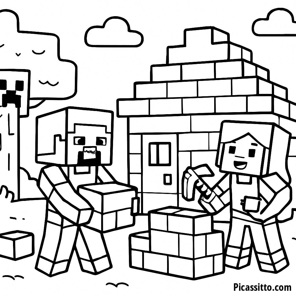 Aproveite esta página para colorir gratuita e imprimível de Steve e Alex construindo uma casa aconchegante com um Creeper curioso espiando atrás de uma árvore. Perfeito para os fãs de Minecraft!