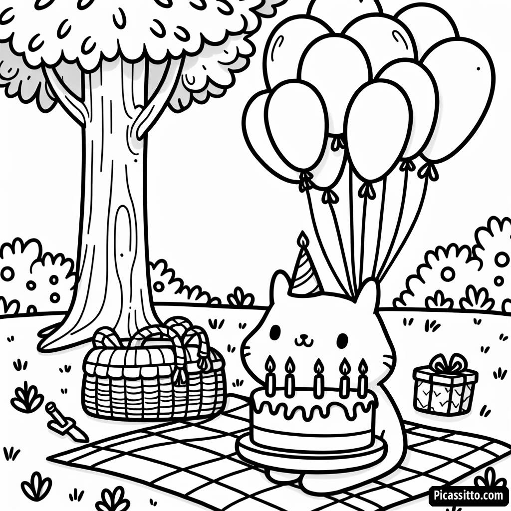Aproveite esta página para colorir grátis e imprimível de um picnic de aniversário ao ar livre, apresentando uma cena encantadora com uma toalha, bolo e balões amarrados a uma árvore.
