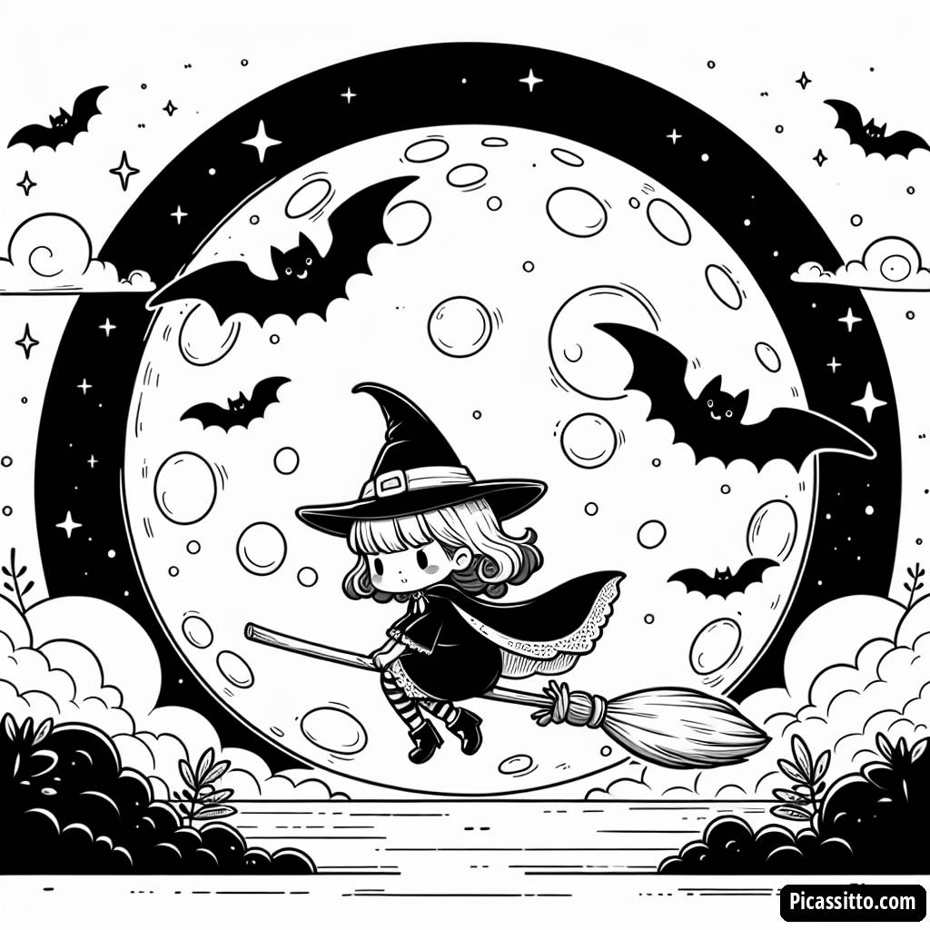 Aproveite esta página para colorir grátis da bruxa em sua vassoura, perfeita para a diversão de Halloween! Deixe sua imaginação voar enquanto a colore voando sobre uma lua cheia cercada por morcegos brincalhões.