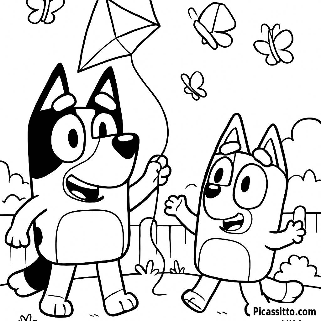 Наслаждайтесь этой бесплатной и распечатываемой раскраской с Блюи и Бинго, играющими на заднем дворе с красочным воздушным змеем и бабочками. Идеально для маленьких художников!