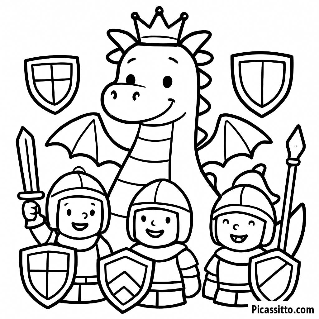 Скачайте эту бесплатную и распечатываемую раскраску с дружелюбным драконом в короне, окружённым улыбающимися рыцарями и щитами. Идеально для юных художников!