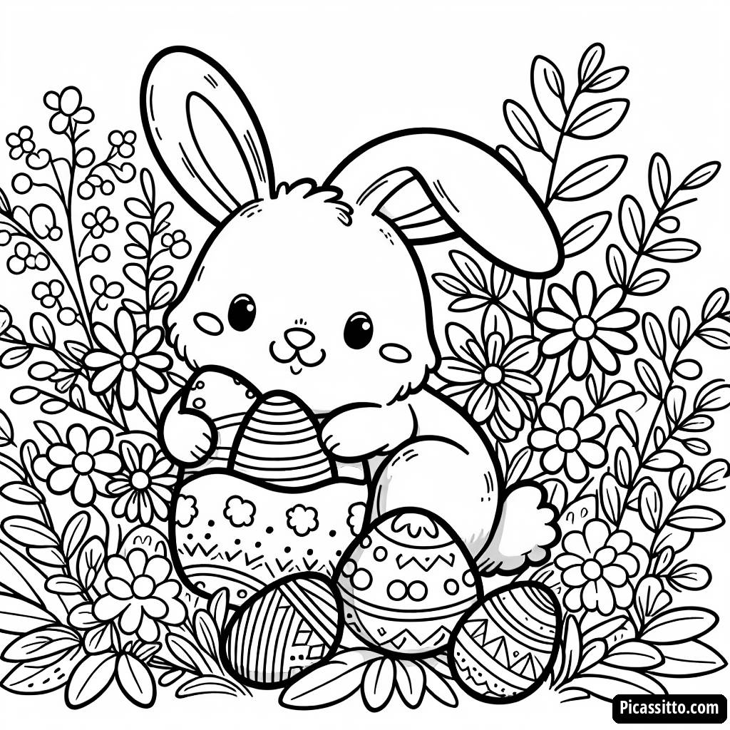 Скачайте эту бесплатную раскраску веселого кролика, прячущего разноцветные яйца за цветущими цветами, идеально подходящую для веселья на Пасху!
