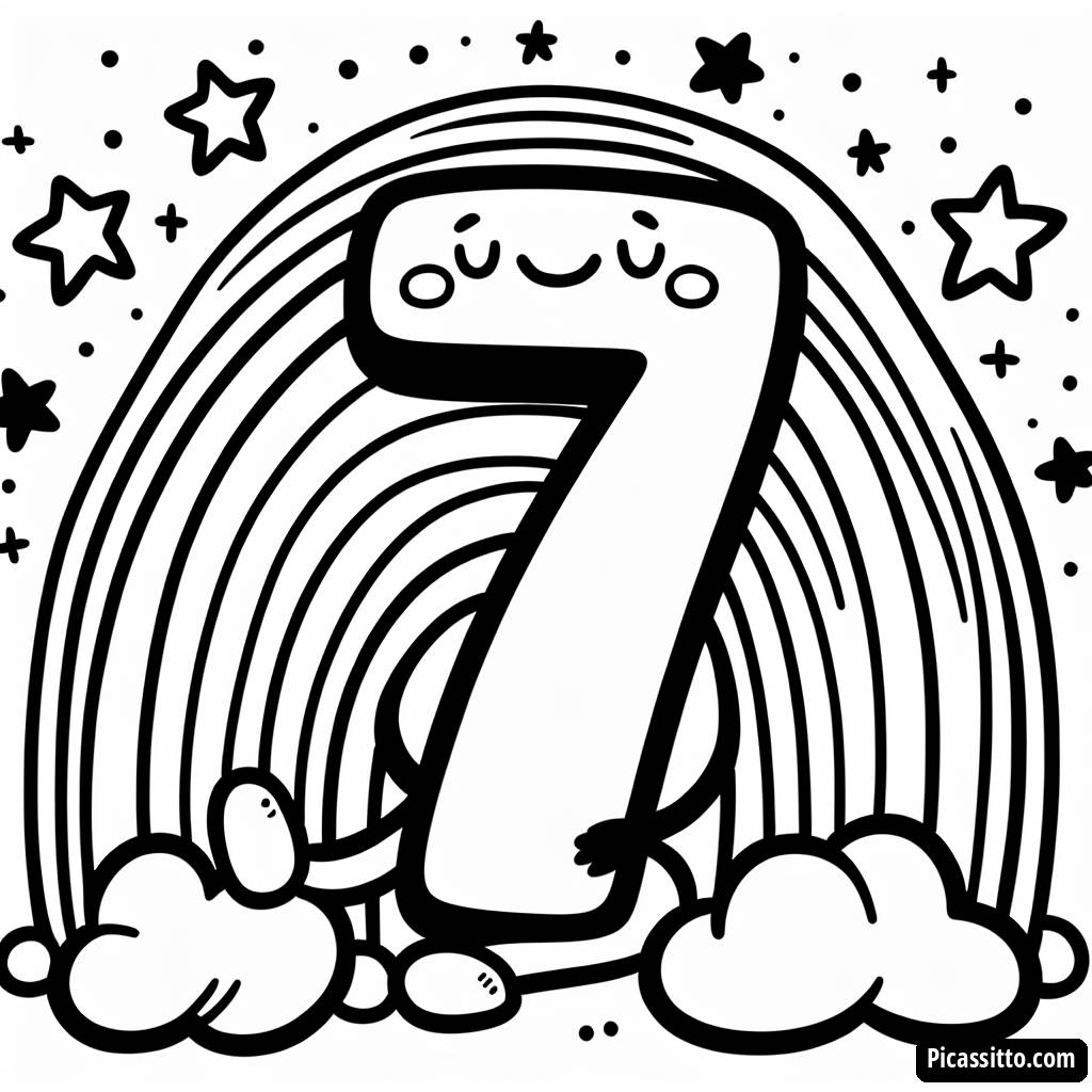 Наслаждайтесь этой бесплатной и печатаемой раскраской с веселым номером 7, сидящим на радуге, окруженном семью звездами!