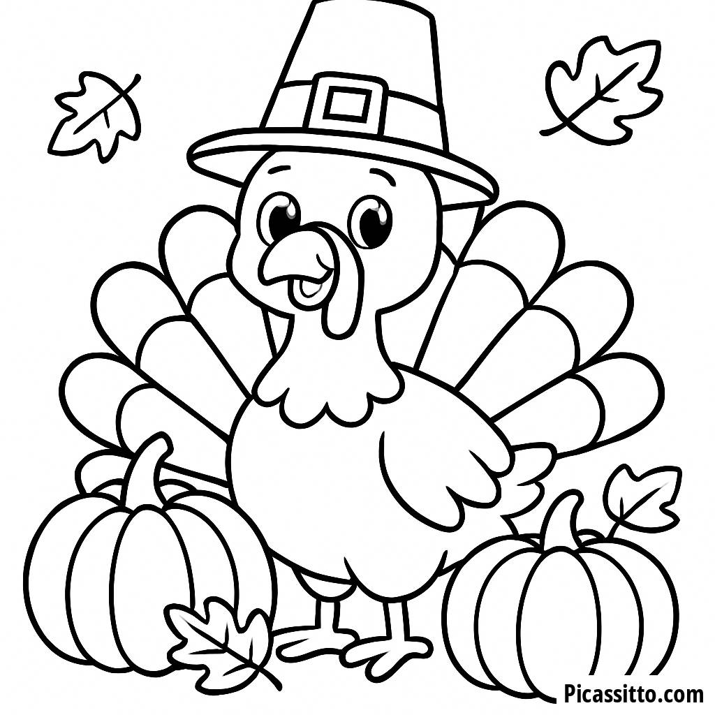 Наслаждайтесь этой бесплатной и распечатываемой раскраской с веселым индейкой в пилотке, окруженным тыквами и осенними листьями. Идеально для веселья на День Благодарения!