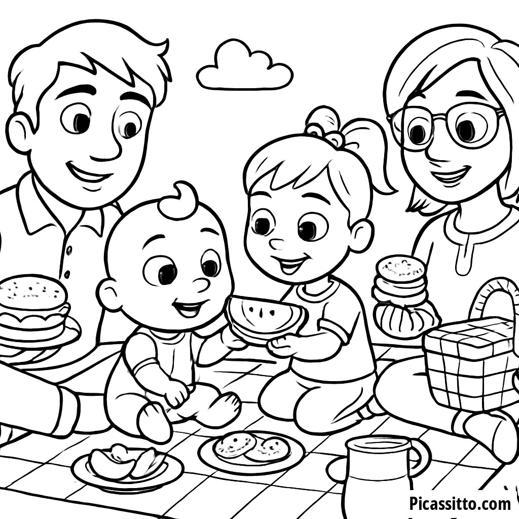 Наслаждайтесь прекрасным днем с семьей Cocomelon на пикнике! Эта раскраска бесплатная иPrintable, идеально подходит для маленьких художников.