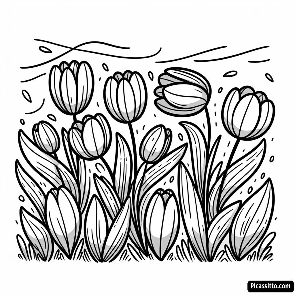 Наслаждайтесь этой бесплатной и печатной раскраской с цветными тюльпанами, которые колышутся на легком ветерке, идеальной для детей, чтобы развивать их творчество!