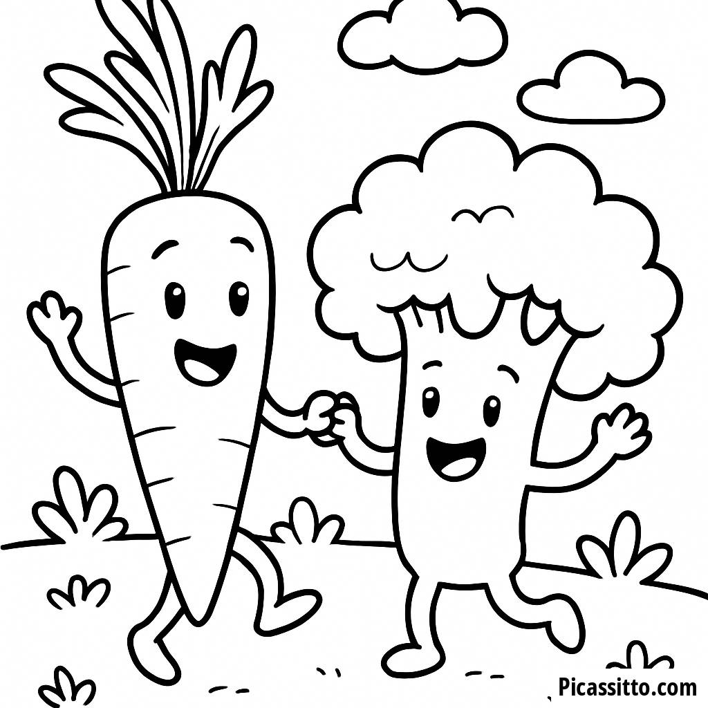 Скачайте эту бесплатную и распечатываемую раскраску с веселой морковкой и брокколи, танцующими вместе в ярком саду!