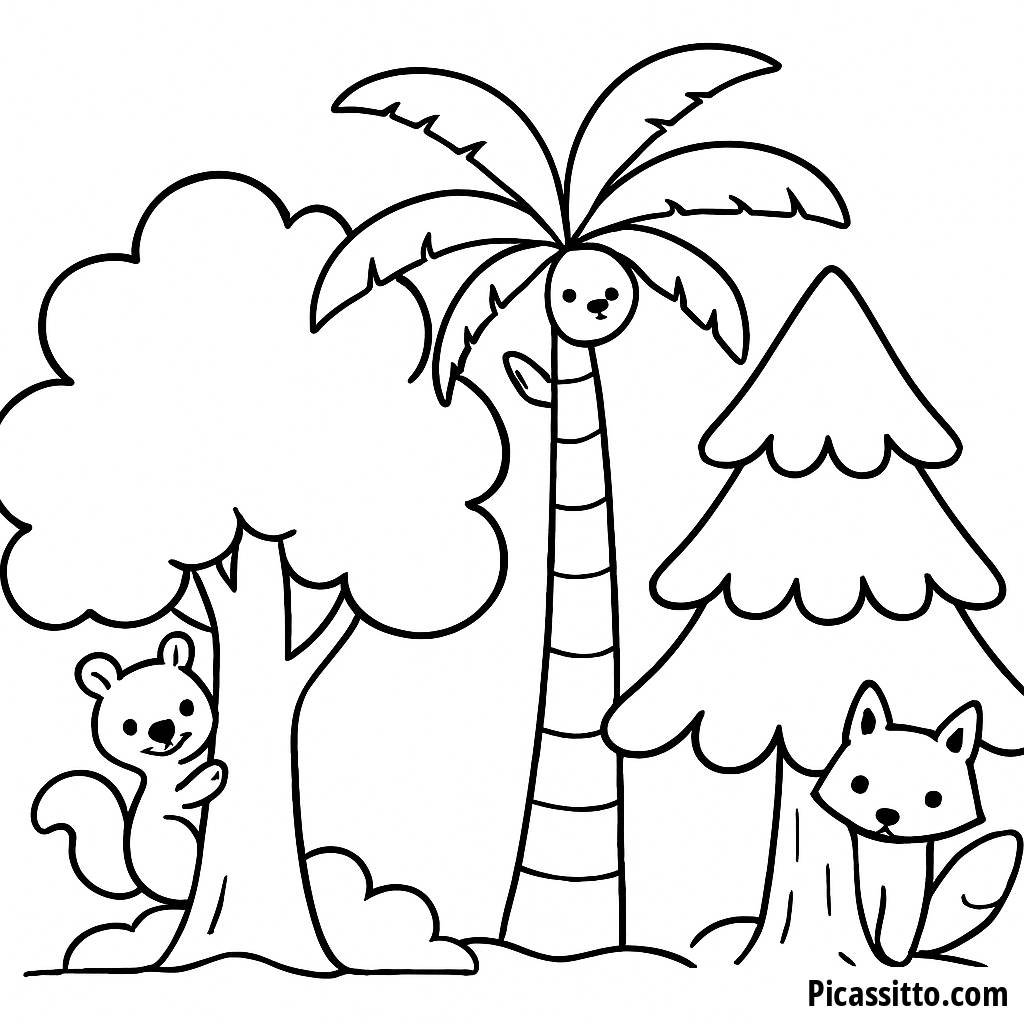 Наслаждайтесь этой бесплатной и печатной раскраской, на которой изображены разнообразные деревья: дуб, пальма и сосна, с игривыми животными, прячущимися среди них. Идеально для детей, которые любят природу!
