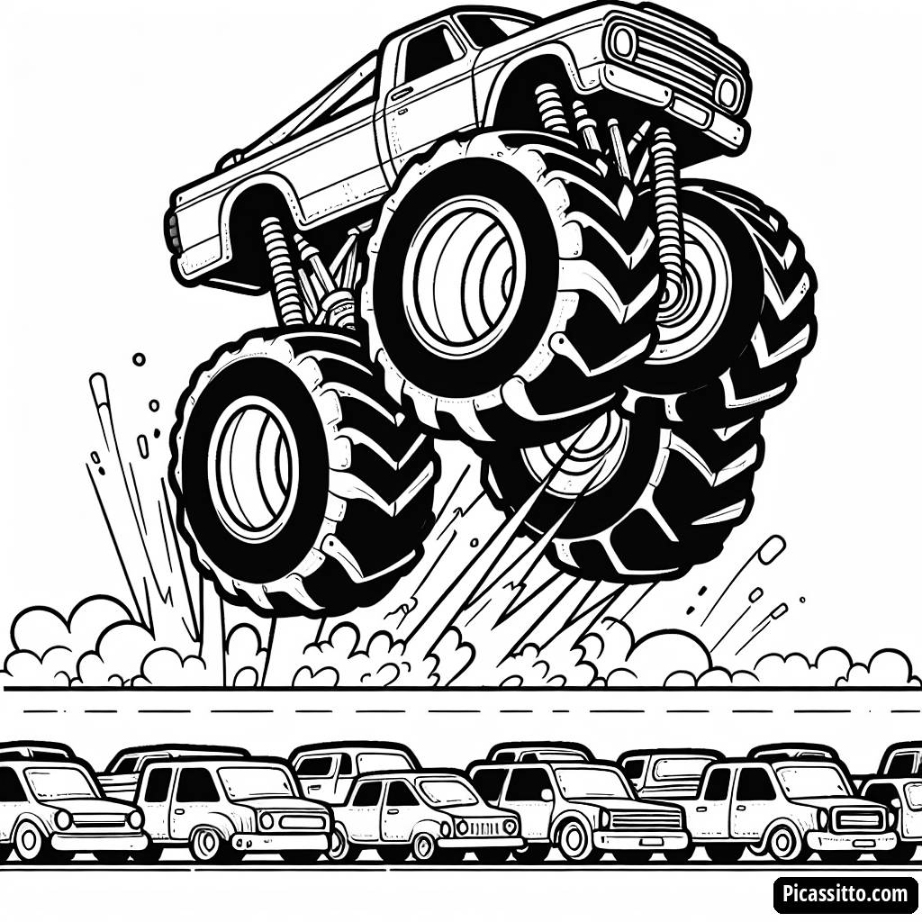 Скачайте эту бесплатную раскраску с эпичным монстр-траком, прыгающим через ряд машин. Идеально для детей, которые любят грузовики и приключения!