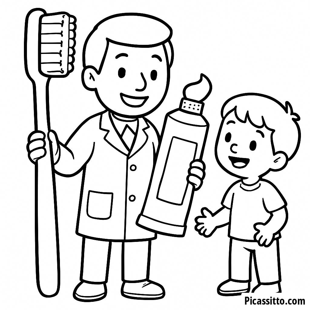 Скачайте эту бесплатную и printable раскраску дружелюбного стоматолога, где заботливый стоматолог показывает ребенку гигантскую зубную щетку и зубную пасту!