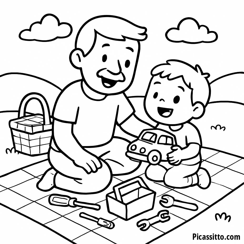 Наслаждайтесь этой бесплатной и распечаткой раскраской пикника на День Отца с папой, ребенком и инструментами для ремонта игрушек. Идеально подходит для празднования особого дня для папы!