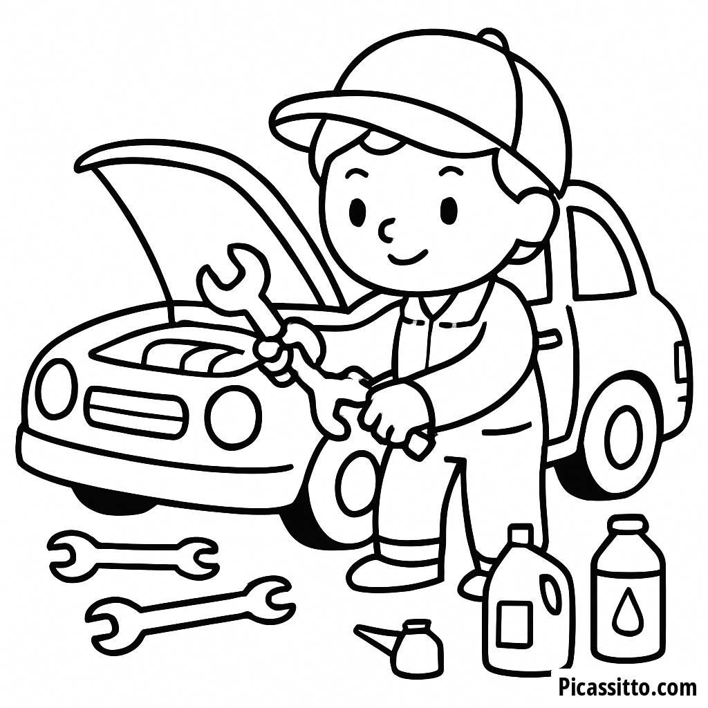 Скачайте эту бесплатную и распечатываемую раскраску механика, изображающую механика, который чинит машину, окруженный инструментами и банками с маслом. Идеально подходит для маленьких ручек, чтобы проявить креативность!