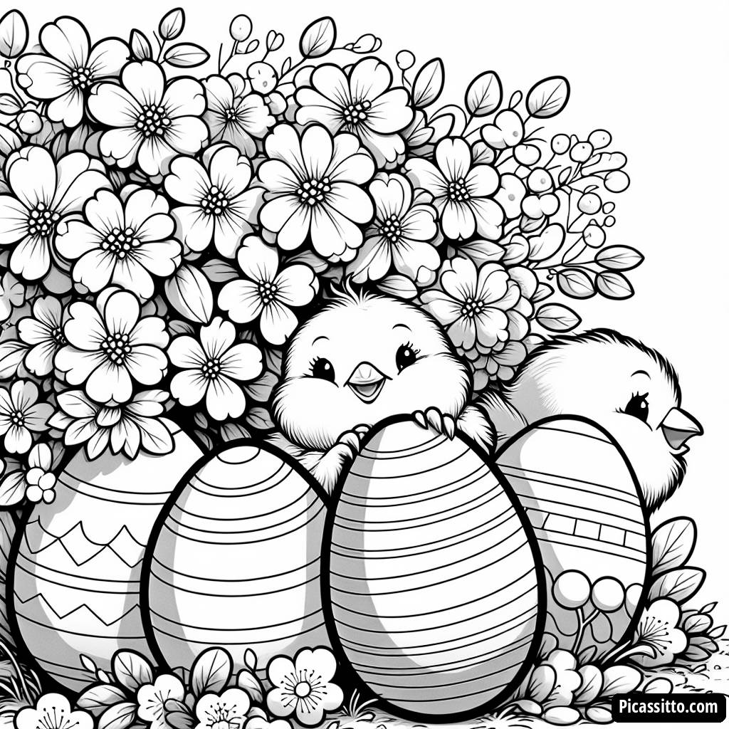 Наслаждайтесь этой бесплатной и распечатываемой раскраской Счастливых Цыплят, идеально подходящей для празднования Пасхи с яркими украшениями и цветущими цветами!