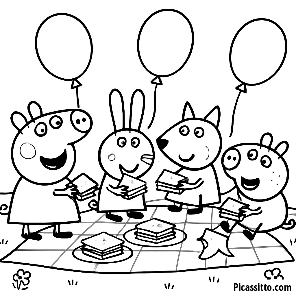 Присоединяйтесь к Пеппе и ее друзьям на веселом пикнике с сэндвичами и шариками! Эта раскраска доступна для бесплатной загрузки и печати.