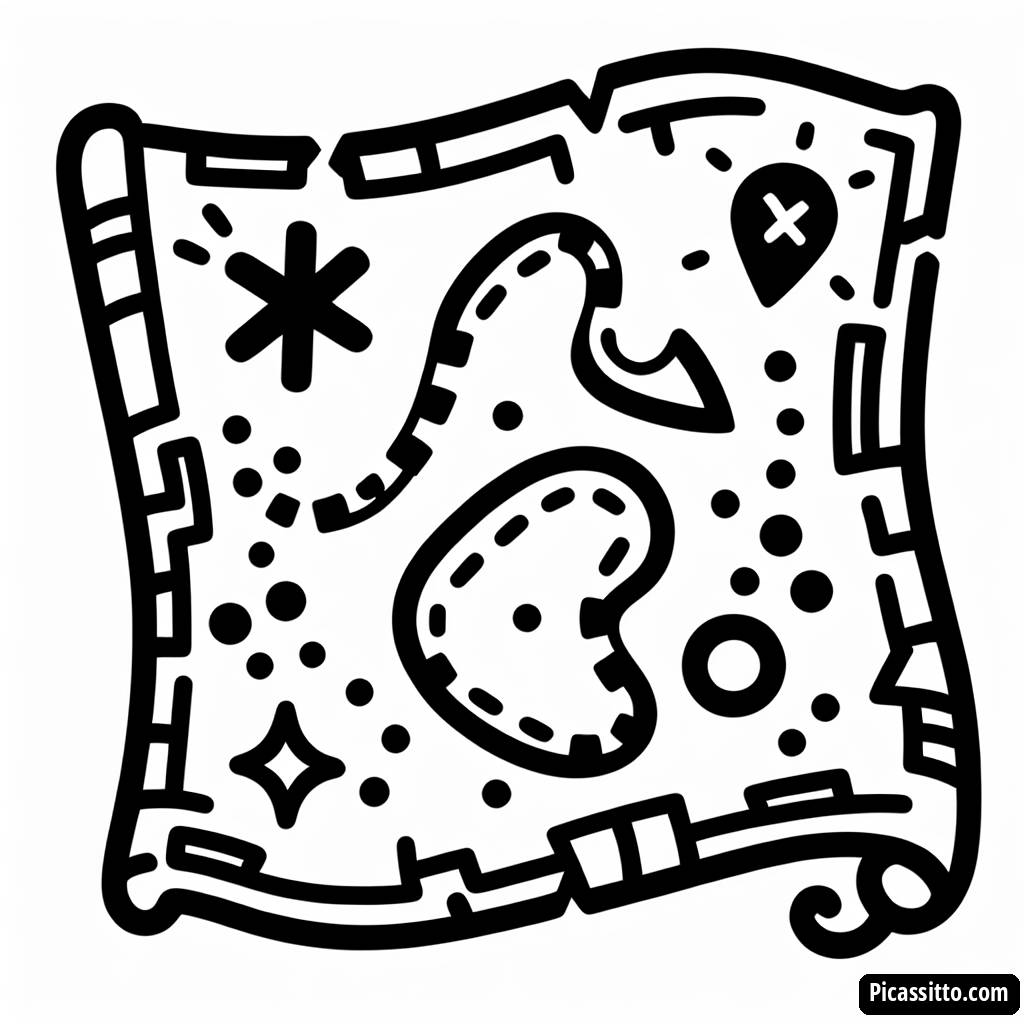 Привет, юные искатели приключений! Скачайте эту бесплатную раскраску «Карта Сокровищ Пирата» с X, указывающим на место, и пунктирными путями для часов увлекательного рисования.