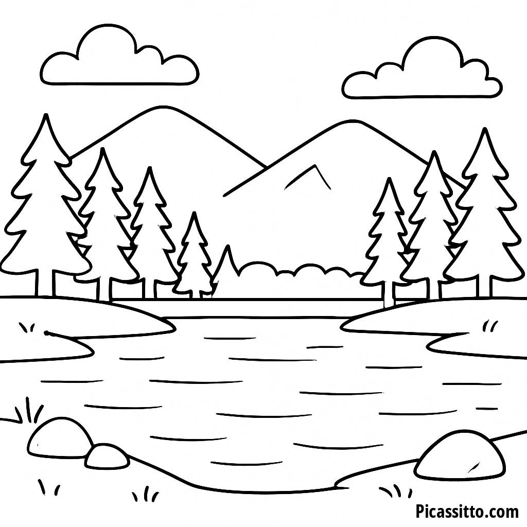 Насладитесь спокойным моментом с этой раскраской спокойного озера, на которой изображены сосны и величественные горы на заднем плане. Это бесплатно и доступно для печати.