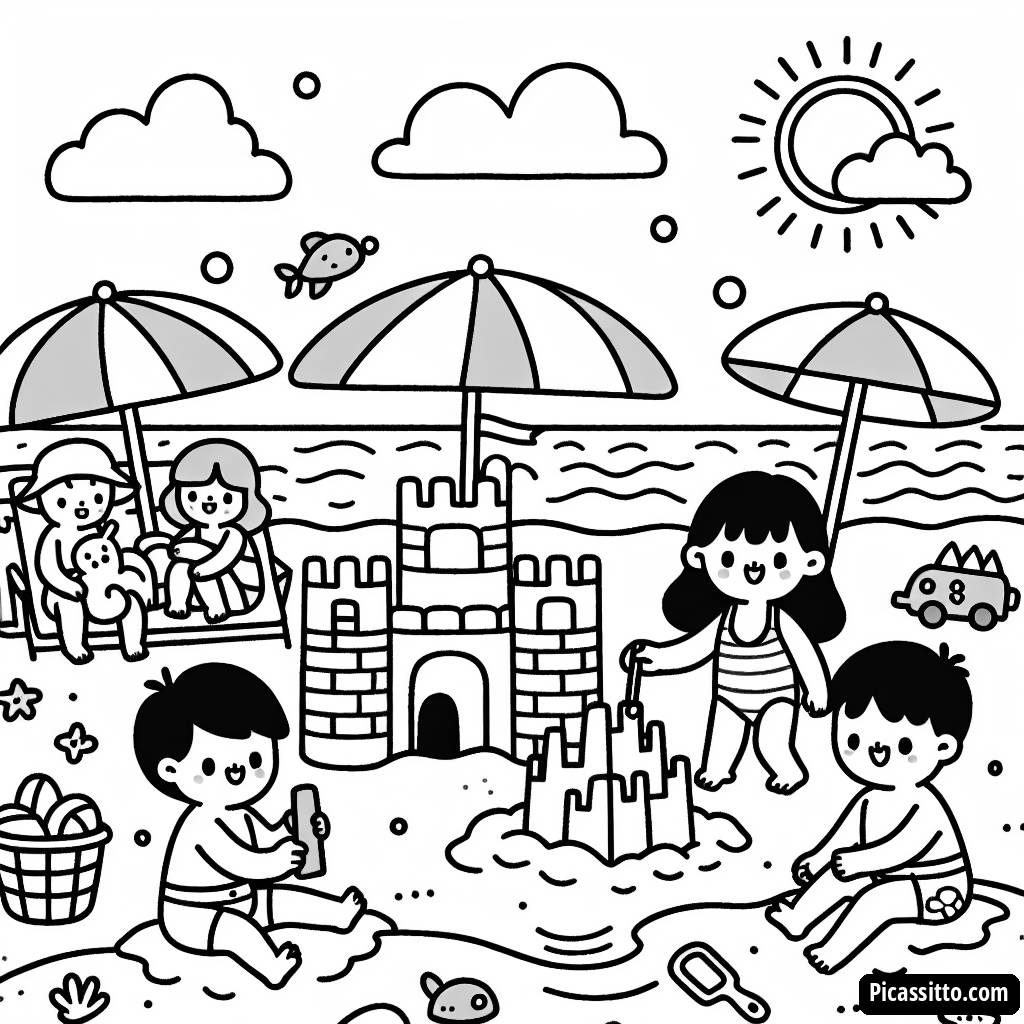Наслаждайтесь этой бесплатной и распечатываемой раскраской с детьми, строящими песчаный замок под солнцем на пляже.