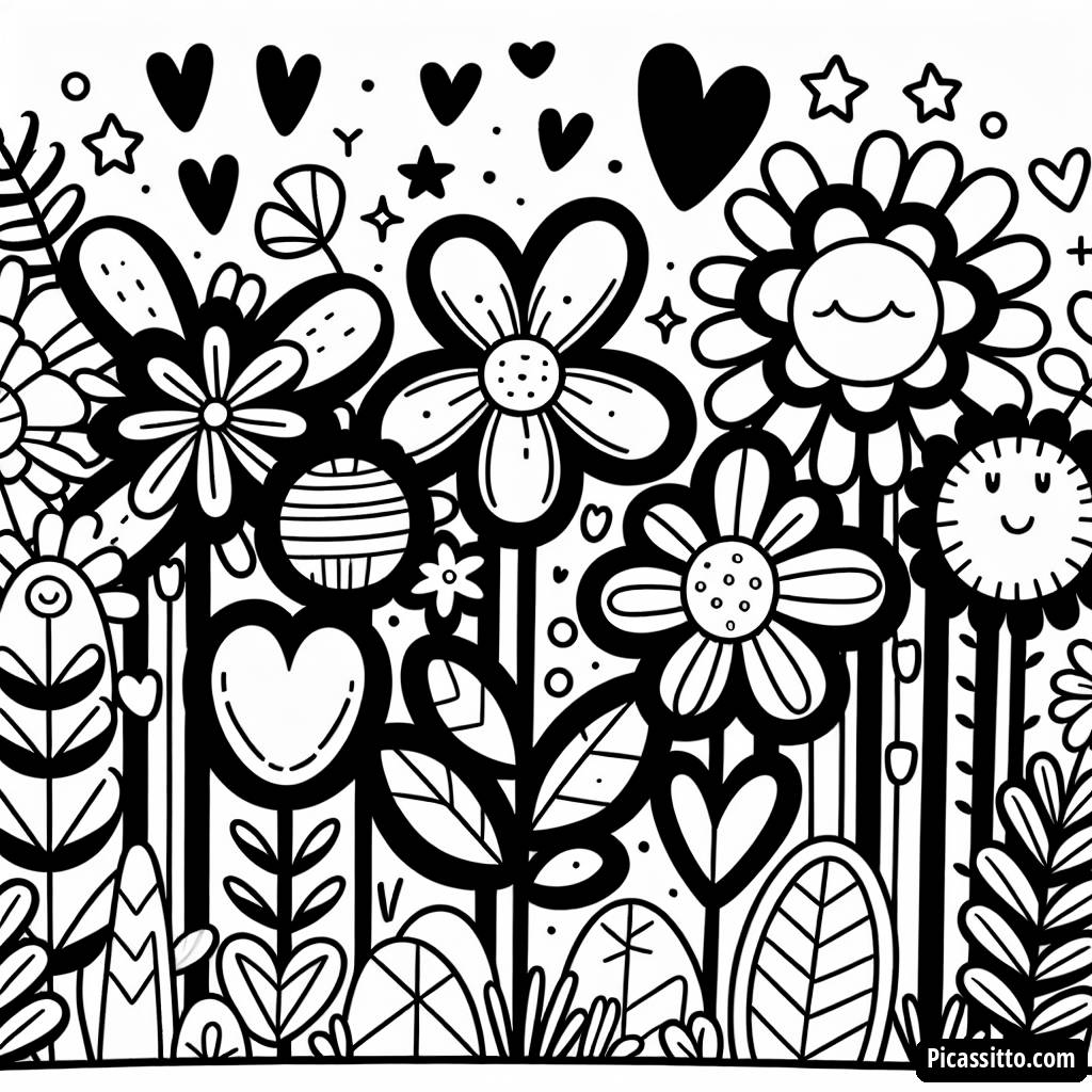 Исследуйте свое творчество с нашей бесплатной и распечатываемой раскраской веселого цветочного сада, где каждый лепесток имеет уникальную форму, такую как звезда, сердце или овал!